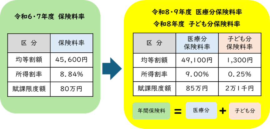 基礎賦課分(医療分)の保険料率は、2年に一度見直しが行われます。また、令和8年度から「子ども・子育て支援金制度」が開始され、医療分と合わせて子ども・子育て支援金分(子ども分)が保険料として徴収されます。